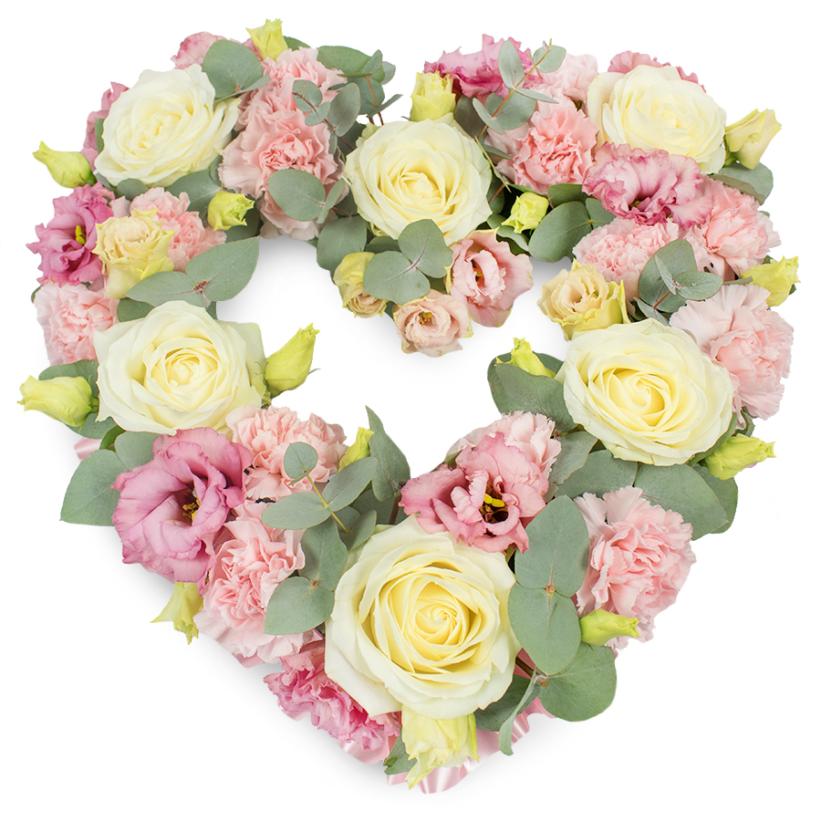 Celebrate cherished memories with our luxurious open heart arrangement. This captivating bouquet features a stunning combination of pristine white roses, elegant pink carnations, enchanting pink lisianthus, and aromatic eucalyptus leaves, all meticulously hand-selected to ensure unparalleled freshness.